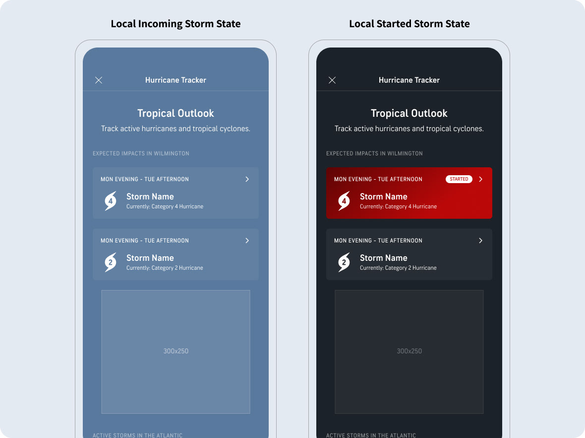 I created a brand new tab in the navigation that would trigger when a tropical storm or hurricane was present. Also, optimized the alert banners to show approaching storms that may impact the users current location. These entry points would take the user to a storm list that would display all local and active storms. This allowed the user to prioritize action and enter the hurricane detail page to learn more.