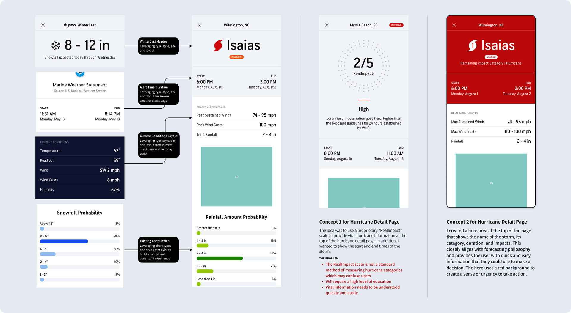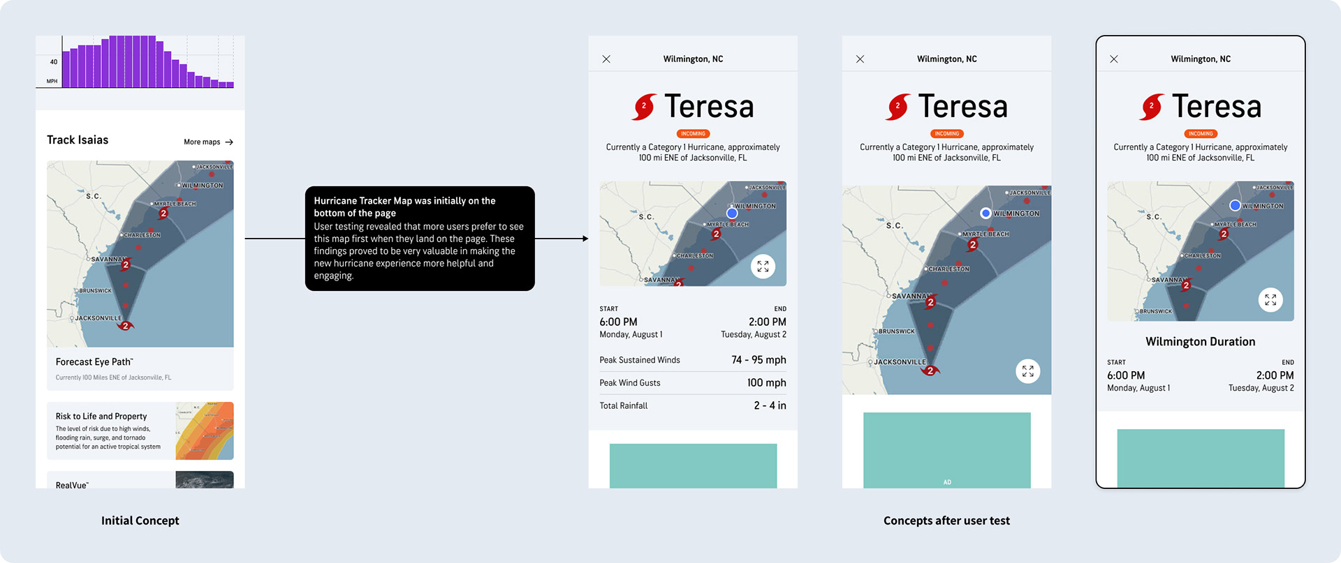 There wasn’t an easy way to display the hurricane information so it is easily understood. We needed to leverage forecasting philosophy and user testing to establish an excellent information architecture and hierarchy of data.