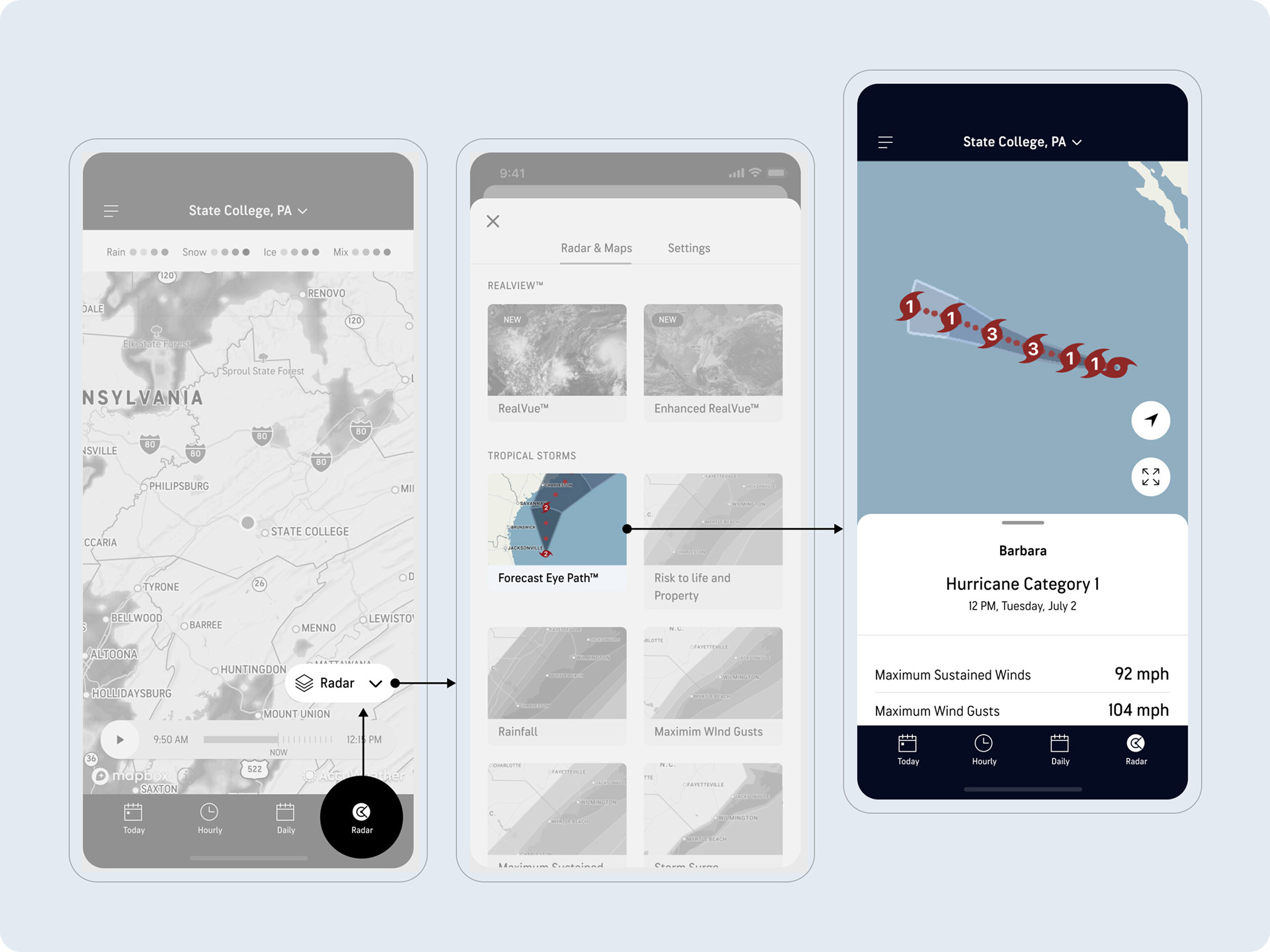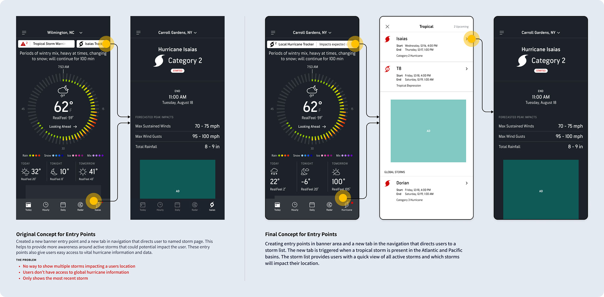 While taking a deep dive into the previous experience, we (product and design) uncovered many opportunities for improvements and enhancements. Some of the improvements were around visibility and the overall user flow. For instance, users only had access vital hurricane updates and data by opening a specific tropical map layer on the radar page. There was no obvious communication or entry points within the app if an active or incoming hurricane was present. After this discovery, awareness and visibility was the top priority.
