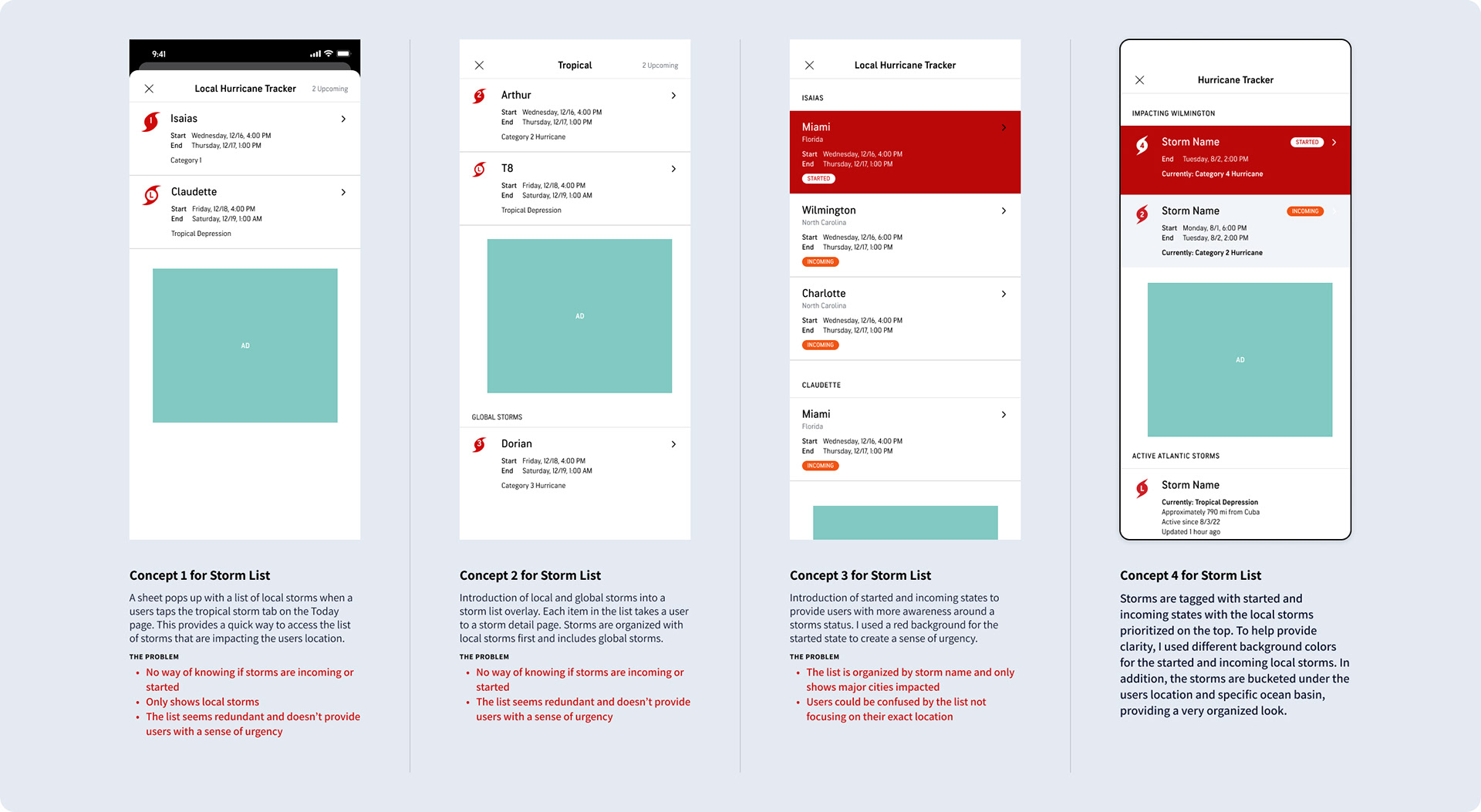 Users didn’t have a way to view multiple active storms. We needed to find a way to create an aggregated list of all tropical storm activity to make this experience as helpful and actionable as possible.